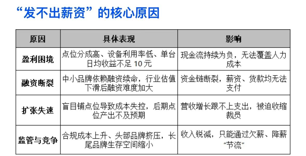 嗨大家好!這兩天大家都在吃瓜,吃瓜是讓大家去思考,共享充電寶應(yīng)該怎么干。給錢+給貨+0首付+配資,等模式是互利互贏會(huì)走到那個(gè)方向,你以為你得便宜,他以為能力實(shí)力很強(qiáng),可以支撐走向輝煌。前天就吃瓜說前二十品牌暴雷了,沒過幾天就博主又來揭秘,拖欠工資了。延遲了三天,這個(gè)揭秘大家都在猜是誰,有熱線網(wǎng)友評(píng)論說是咱們倍電,我們還是感謝這位熱心網(wǎng)友,對(duì)倍電關(guān)注哈,咱家董事長(zhǎng)也是正面回應(yīng),倍電不缺錢,運(yùn)營(yíng)成本一個(gè)月30萬,不存在拖欠,不要亂造謠。上面小編也聊了吃瓜,不是讓咱們?nèi)ト⌒e人,而是思考,我們應(yīng)該怎么做,避免這樣事情在我們創(chuàng)業(yè)者身上發(fā)生。來大家看下上面分析,主要是有四個(gè)部分組成,第一盈利困難:點(diǎn)位分成高,設(shè)備利用率低,原來商家是只有1臺(tái)或者2臺(tái),不是用你家就是用他家,現(xiàn)在市場(chǎng),商家平均每個(gè)商戶有5個(gè)品牌可以選擇,不知名品牌不用,設(shè)備質(zhì)量看起來不好沒人用,價(jià)格高的沒人用,在選擇上你品牌有什么核心競(jìng)爭(zhēng)力?思考這些問題。第二問題資金斷裂:中小品牌依賴融資續(xù)命,共享充電寶行業(yè)從開始到現(xiàn)在能容到資沒幾家,更何況現(xiàn)在這個(gè)市場(chǎng),眾多品牌分蛋糕,那個(gè)資本沒長(zhǎng)眼會(huì)融資,認(rèn)清現(xiàn)實(shí)就是別指望融資,和我們倍電董事長(zhǎng)一樣時(shí)刻記得壓縮運(yùn)營(yíng)成本,才是你在這個(gè)行業(yè)能存活更本。第三擴(kuò)張失速:盲目點(diǎn)位導(dǎo)致成本失控,后期點(diǎn)位產(chǎn)出不及預(yù)期,其實(shí)這個(gè)問題和第二是關(guān)聯(lián)的,就是不要不計(jì)成本去擴(kuò)張。